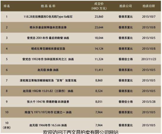2013年度香港中國(guó)藝術(shù)品拍賣前十名