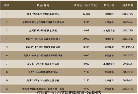 2013年度內(nèi)地中國藝術(shù)品拍賣前十名