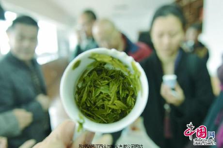 2014年04月03日,浙江省杭州市,在2014西湖龍井明前茶拍賣會(huì)舉行前,競(jìng)拍人在品嘗各標(biāo)的西湖龍井茶的品質(zhì)。